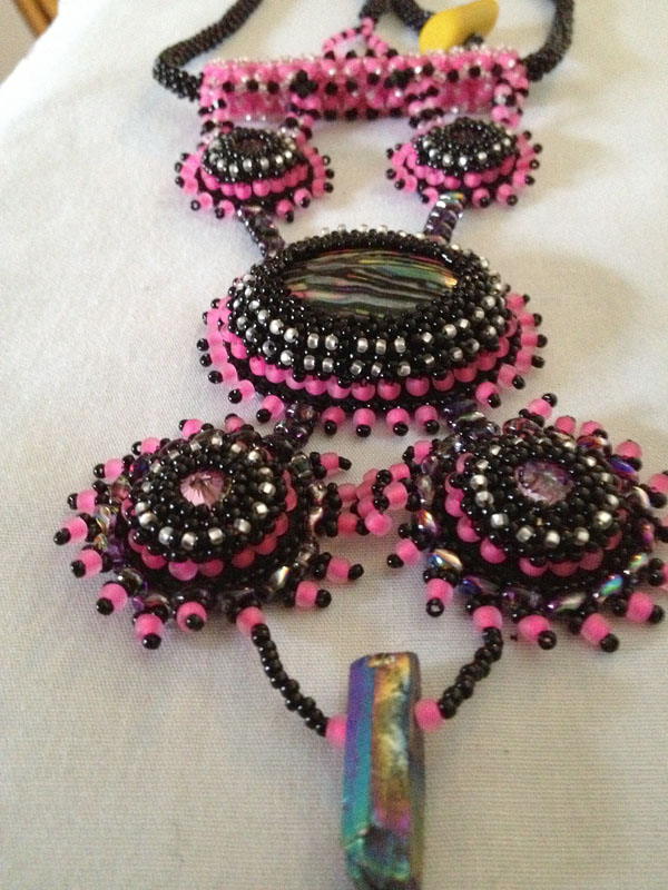 | Using the center cabochon and 4 of the RAW caged Rivolis, once again, I played a game of design. I decided to use the size 8 Shocking Pink beads to embellish each of the 5 component. To connect them all, I used the Super Duos in a herringbone type of bead weaving to connect the 5 components. They I did a simple stringing with the bottom 2 component with one piece of quarts for my central focal point of the necklace. During thie time, I played with the idea of having it swinging from a larger peyote tube, but no matter how I tried to connect the two components together, the swinging focal and the peyote tube just would not work well. So back to the drawing board |